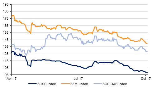 Speculation about the next Fed Chair intensified further last week with John Taylor, a perceived hawk, believed to be leading the race. US Treasury curve steepened with yields on 2yr, 5yr, 10yr and 30yr all closing up at 1.58% (+4bps w/w), 2.02% (+7bps), 2.38% (+8bps) and 2.90% (+8bps) respectively. Still unsettled situation in Germany and on Catalonia front along with ongoing Brexit issues left sovereign yields in Europe following suit with the UST. Yields on 10yr Gilts and Bunds closed higher by 5bps to 1.33% and 6bps to 0.45% respectively.