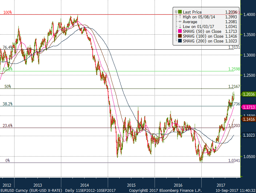 The latest rise in EURUSD not only reinforces the daily uptrend that has been in effect since 21 December 2016, but increases the risks of immediate short term gains. Having set a new 2017 high on Friday of 1.2092, levels not seen since 2 January 2015, the cross looks likely to test the 50% five year Fibonacci retracement of 1.2167. A break of this level would pave the way for further appreciation towards 1.2598, the 61.8% five year Fibonacci retracement, which remains a possible scenario, if the ECB do not have a “pain threshold” circa the 1.25 level. With this in mind, we have revised our forecasts for EURUSD appropriately (see page 6)
