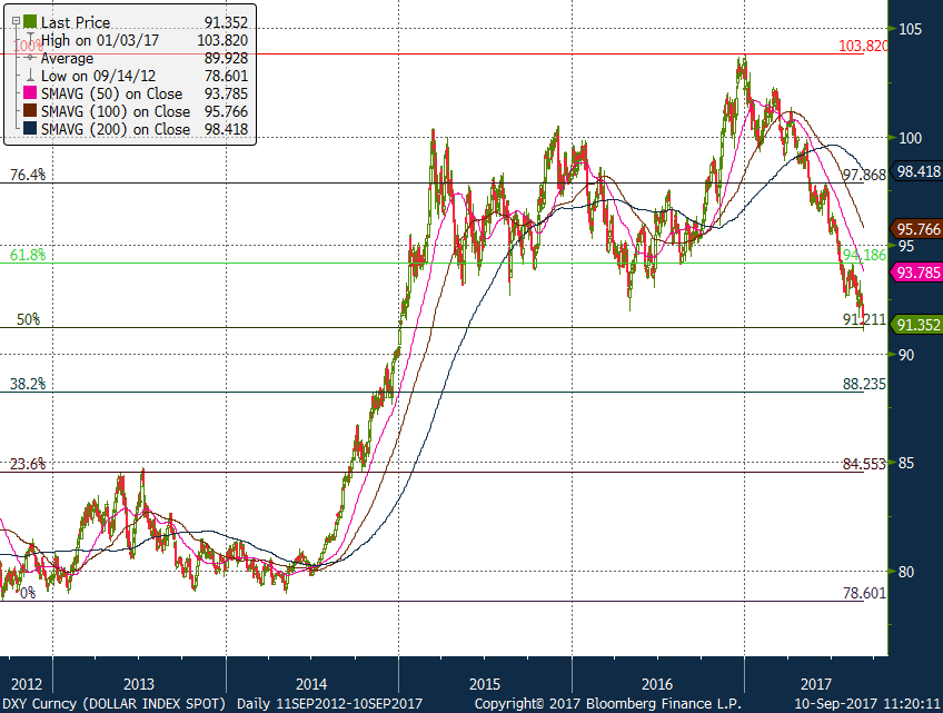Indeed the Dollar Index fell 1.6% over the course of the week, falling from 92.81 to 91.33 and even falling as low as 91.01 during Friday’s trading session. These levels have not seen since 2 Jan 2015 and contribute to technical developments which leave the index looking vulnerable to greater declines. We had mentioned in our 20th August edition of the FX Week that despite earlier gains to 93.42, the daily downtrend that has been in effect since January 6th 2017 remains firmly intact and highlighted the risks of further declines towards the one year lows of 92.55 being a distinct possibility. The declines over the last week materialized into a sustained break of this level and with new yearly lows reached, the risks continue to remain to the downside. We would expect a break and close below the 50% five year Fibonacci retracement of 91.21 to lead to further declines towards 88.23, the 38.2% five year Fibonacci retracement.