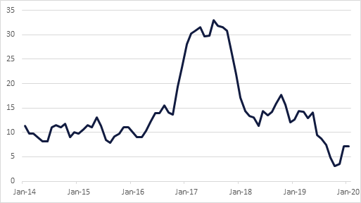Egypt’s CPI inflation ticked up to 7.2% y/y in January, from 7.1% the previous month. On a m/m basis it rose from -0.2% to 0.7%. While this remains far higher than the multi-year lows seen in October and November (3.1% and 3.6%), it is nevertheless well within the CBE’s target range of 9% +/- 3 by year-end. While we do not anticipate any move by the MPC at its February 20 meeting, real rates remain over 5%, and we maintain our expectation of around 150bps of cuts later in the year.