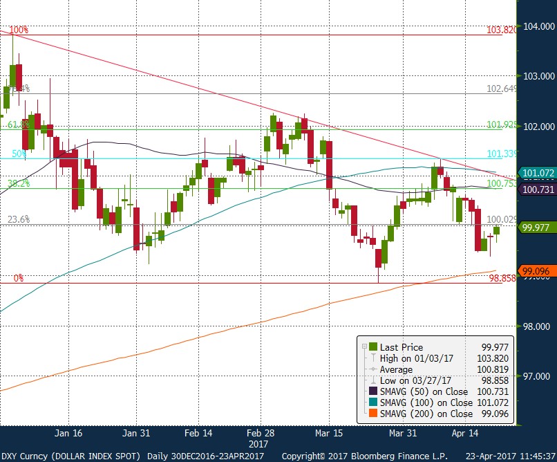 The dollar remains lower YTD in 2017 respective to the other major currencies, with the exception of CAD. As shown in the graph below, the Dollar Index downtrend that has been in effect since the start of the year, and remains intact with recent closes indicating further softness in the month ahead. After finding resistance at the 100 day moving average on April 7th, the index proceeded to breach the 50 day moving average support on April 12th. While the 100.03 level (the 23.6% 2017 year to date Fibonacci retracement) initially served as another support, the index made a sustained breach of this level on 18th April 2017. With the index currently trading at 99.98 below these key levels, the short term outlook looks bearish and sets up a test of the 200 day moving average of 99.10.