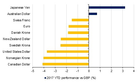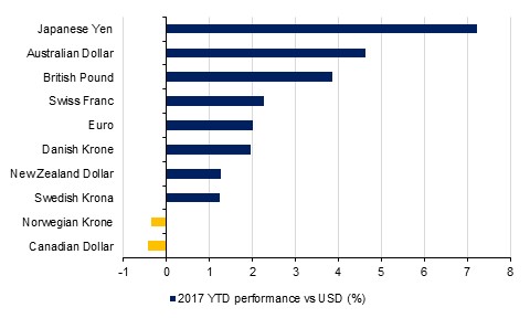 Sterling has continued to build on its 2017 gains, with GBPUSD currently trading at 1.2817 after gaining 2.34% last week. This move was accompanied by many key technical developments. Firstly, the pair has broken the daily downtrend that had been in effect since August 29th 2016. Secondly, the pair performed a sustained break of the 100 day and 200 day moving averages (see below). With this in consideration, we see a high risk of a retest above 1.30 (close to the one year 61.8% Fibonacci retracement) which could be catalyzed by short covering of the near record level of 99.5k net short position on GBP according to the CFTC’s commitment of traders report (see chart on page 8). A break of this level would increase our confidence of the pair ending the year above our Q4 2017 forecast of 1.35 as highlighted above.