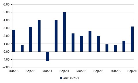 US Revised Q3 Annualized GDP increased at a 3.2 percent q/q instead of the previously reported 2.9 percent pace, according to data from the US Commerce Department in its second estimate for the quarter. This was this strongest growth level registered since Q3 2014, and significant pick up from the 1.4% growth rate in Q2 this year. Consumer spending, which accounts for more than two-thirds of U.S. economic activity, was also revised upwards, increased at a 2.8% rate in Q3 compared to the earlier estimate of 2.1%. Furthermore in a separate report, consumer confidence in the US climbed to a nine year high, according to a report from the Conference Board, with consumers optimistic about the labour market and current business conditions.