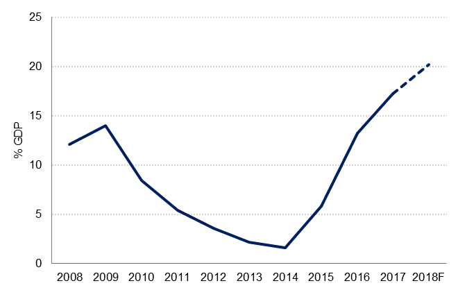 In addition, the government has announced a further SAR 133bn in ‘off budget’ spending that will be financed by the Public Investment Fund (PIF) and National Development Funds (NDFs). PIF will set aside SAR 83bn for ‘mega infrastructure, real estate and transportation’ projects; this is likely to include funding for the new city, Neom that was announced at the investment summit in November. NDF funds of SAR 50bn will be used for housing and other initiatives to stimulate private sector growth, create jobs and boost efficiency. Overall, public sector spending is expected to exceed SAR 1.1tn (USD 296bn) in 2018, making it the biggest ever fiscal stimulus in the Kingdom.