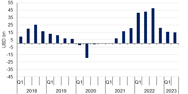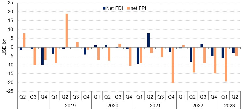Foreign portfolio investment also showed a sizeable outflow of USD 24.3bn in H1 2023, likely reflecting PIF’s ongoing investment in global equity markets, with large holdings in major gaming and technology firms around the world.
