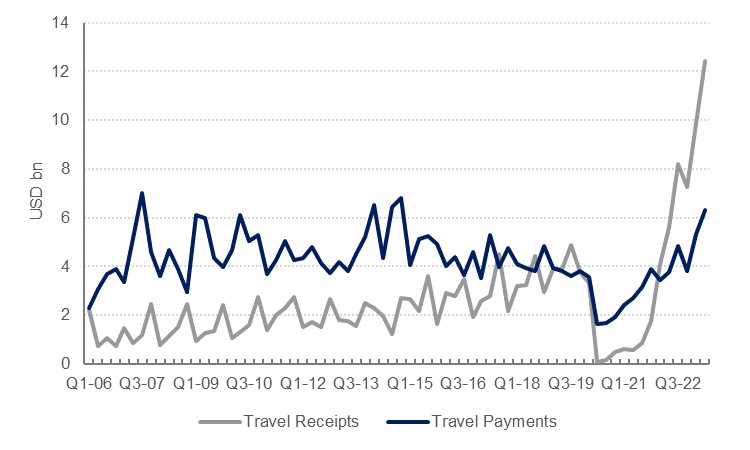 While the services balance remained in deficit – the kingdom was a net importer of transportation, construction and other services – the travel services balance showed a marked improvement. Travel receipts reached a record high of USD 12.4bn in Q2 2023, underpinned by a surge in visitors to the kingdom as new visas made it easier for both business travellers and tourists to go to Saudi Arabia.
