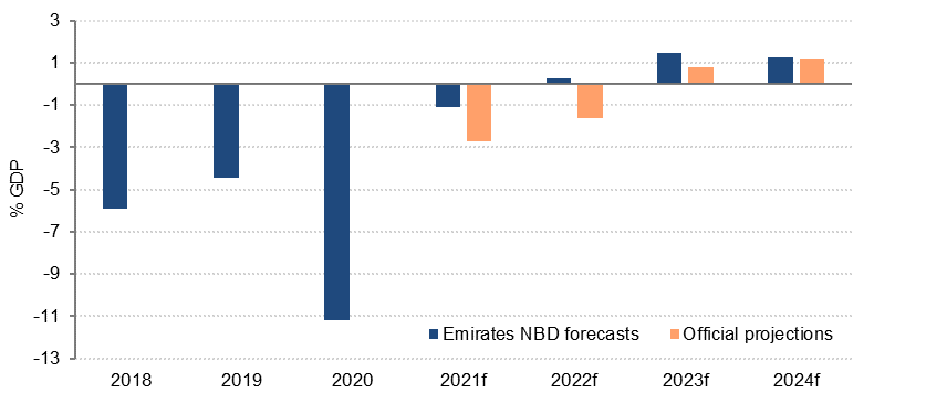 For 2022 and 2023, the government revised up its forecast for oil revenues next year and in 2023 by 4.5% and 4.3% respectively, but kept expenditure projections unchanged from the 2021 budget’s medium term forecasts. This implies a cut to budget spending next year of almost -6%, with another -1.5% decline in 2023. The official projections show the budget balance moving into surplus in 2023, and reaching 1.2% of GDP in 2024.