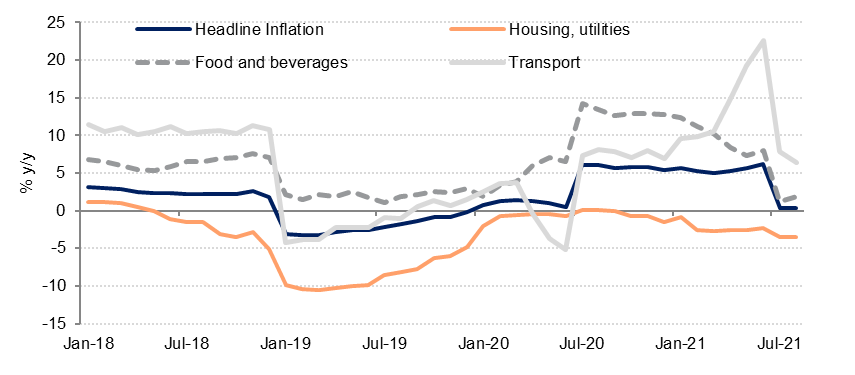 Headline inflation has declined sharply on base effects (last summer’s VAT and customs duty increases are now in the base), falling to 0.3% y/y in August from 6.2% y/y in June. While food prices and transport costs have increased on a m/m basis over the last few months, these have been offset by lower housing costs. We expect consumer inflation to average 3% in 2021, down from 3.4% in 2020.