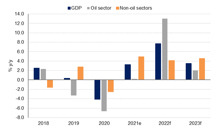 For 2022, we retain our expectations for significantly faster hydrocarbons GDP growth this year as oil production and investment rises. We expect oil & gas GDP to grow 13.0% in 2022, and there is upside risk to this forecast given the current oil/ geopolitical dynamics. We have increased our estimate for government spending this year slightly, to take into account some slippage as oil revenues are expected to rise sharply, and as the government is likely to absorb some of the increase in global food and energy prices rather than fully pass these on to consumers. Nevertheless, we still expect fiscal discipline to be broadly maintained. As a result, we think total non-oil GDP growth (including government services) is likely to slow to 4.1% this year from 4.9% in 2021. Headline GDP growth should come in at 7.7% this year, before slowing to 3.5% in 2023.