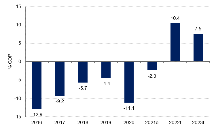 Taking into account our new oil price forecast of USD 112/b for Brent, we now expect the budget to post a surplus of 10.4% of GDP, compared with a deficit of -2.3% in 2021. We expect the budget surplus to be used to boost foreign reserves at the central bank and to fund the Public Investment Fund, which has committed to investing USD 40bn in the Saudi economy every year through 2025.