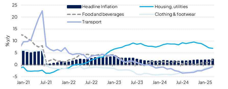 CPI inflation in Saudi Arabia picked up to 2.3% y/y in March, from 2.0% the previous month. This marked the fastest pace of annual price growth since July 2023. On the monthly measure, inflation was at 0.3%, up from 0.2% in February. Headline annual inflation averaged 2.1% in Q1, up from 1.9% the previous quarter and a modest acceleration on the 2024 average of 1.7%. The Q1 pace remains in line with our 2025 forecast for an annual average of 2.0%, and we are maintaining this outlook for now despite the March acceleration. While the dollar, and by extension riyal, has weakened against the major developed market currencies, it has performed more strongly against other regional currencies including the INR, CNY, and EGP and this should alleviate import price pressures to some extent, and the US was the second largest source of imports after China in 2023. Moreover, firms have been discounting, and most components of the basket continue to see fairly weak inflation.