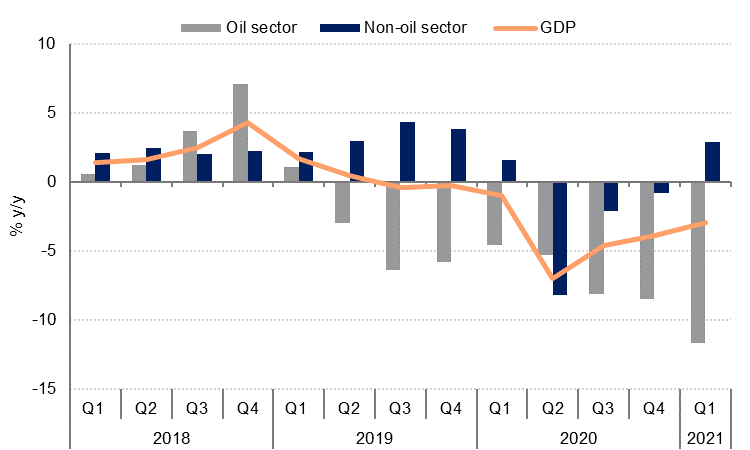 The oil sector contracted -8.8% q/q and -11.7% y/y in Q1 2021 as the kingdom made additional production cuts in February. Consequently, headline GDP contracted -3.6% q/q and -3.0% y/y in the first quarter of this year. While these cuts are being gradually unwound, OPEC+ appears to be taking a conservative stance on output, and as a result we expect the oil sector to be drag on headline GDP growth through 2021. We retain our forecast of 0.7% real GDP growth in Saudi Arabia this year and expect growth to accelerate to over 6% in 2022 on higher oil production and a faster non-oil sector growth.