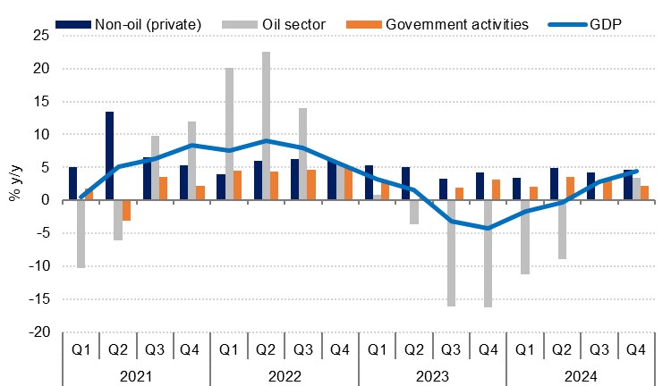 There was positive momentum through the end of the year as Q4 GDP growth hit 4.4% y/y, the strongest pace of growth since Q4 2022. A major contributing factor to this was the return of oil GDP to growth for the first time since Q1 2023 as it expanded 3.4% y/y (Q3 growth was flat). There were no additional OPEC+ oil production curbs implemented through the period, meaning that those introduced 12 months earlier started to pass through into the base and no longer exert a drag on headline output. While oil production in Q4 was down by a moderate 0.6% y/y at 8.95mn b/d in Q4, from 9.00m b/d in Q4 2023, other activity related to hydrocarbons likely provided the positive growth. Condensates and natural gas production is not covered by the OPEC+ agreement, while investment in the hydrocarbons sector is also likely powering growth.