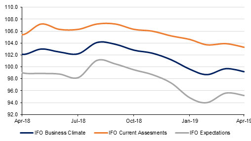 In contrast to expectations for a modest improvement, Germany’s IFO’s Business Climate survey dropped to 99.2 in April from 99.7 the previous month. Accompanied with declines in Expectations (95.2 vs 95.6) and Current Assesment (103.3 vs 103.9), the survey shows that weakness in German production has persisted past the first quarter. Coupled with weak Eurozone PMI data as well as data showing that French manufacturing confidence has slumped to a near four-year low, the reports highlight that a rebound in Eurozone recovery may be some way off and reduce the chances of any normalization of monetary policy from the ECB in 2019.