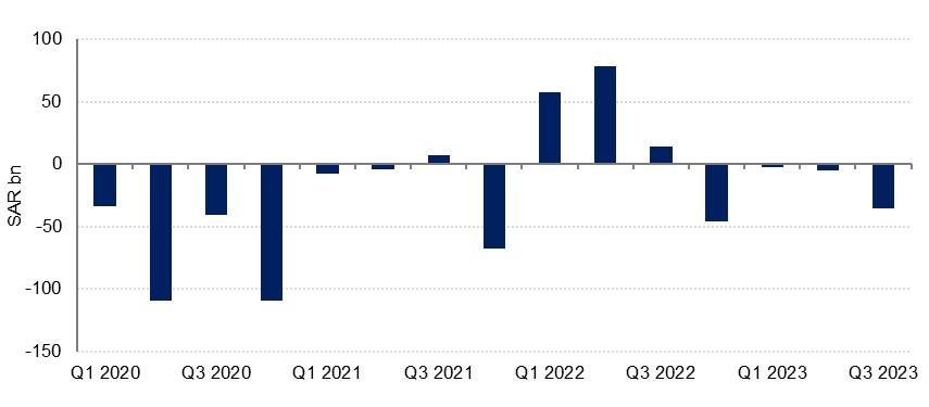 Saudi Arabia’s budget deficit widened sharply in the third quarter, posting a shortfall of -SAR 35.8bn (USD 9.5bn), compared with a deficit of -SAR 8.2bn over the first half. This leaves the deficit over the first three quarters of the year at -SAR 44.0bn, compared with a surplus of SAR 149.5bn over the corresponding period in 2022.