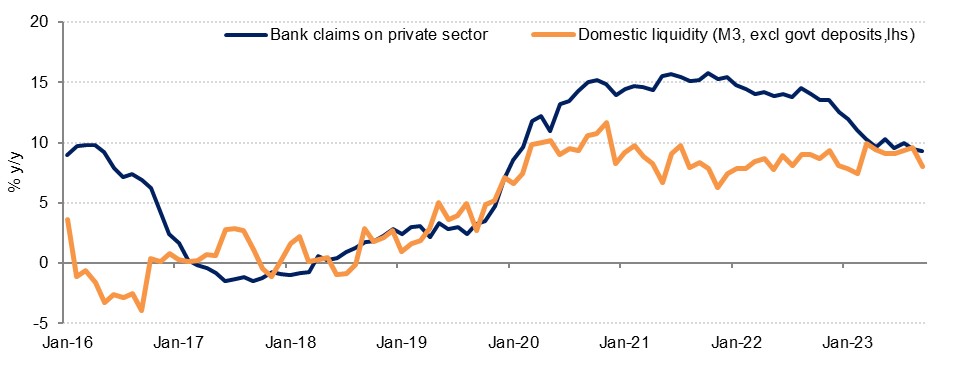 Annual credit growth outpaced broad money supply growth which slowed to 8.0% y/y in September, after the two were broadly in line in August. On a monthly basis, money supply contracted 0.4% m/m in September, the first decline since May. Narrow money (M1) increased 0.7% m/m in September after contracting the two previous months, and the decline in broad money was driven by a 6.9% m/m fall in FX deposits and other quasi monetary deposits.