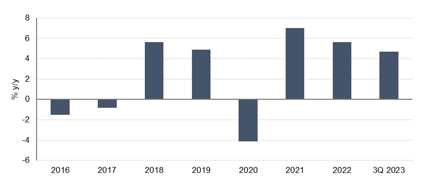 Total bank deposits were up 8.3% y/y in September but registered a 0.4% decline from August’s levels. The growth continues to be driven by government entities, both in demand deposits and time and savings deposits. Higher interest rates are encouraging strong growth in time and savings deposits which are up 49.4% y/y in September, compared with an average annual growth rate of 7.8% over the three years to December. Demand deposits fell 4.8% y/y as they continue to be drawn down by business and individuals (down 6.9% y/y) while government entities’ demand deposits were up 7.7%.