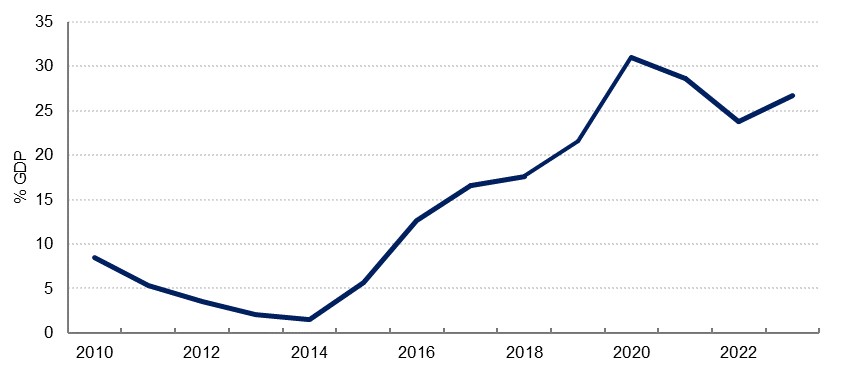 On the expenditure side, total expenditure was up 11.1% last year. Current expenditure rose 8.4%, slightly slower than the 10.8% growth in 2022. Within that, spending on wages and salaries was up 4.7%, while goods and services spending rose 17.5% and social benefits spending was 22.1% higher. Capital expenditure spending accelerated to 30.0%, up from 22.4% the previous year, as the government ploughed ahead with its diversification programme and related expenditure. In terms of sectoral spending, the military remained the largest component despite falling 5.1% over the year.