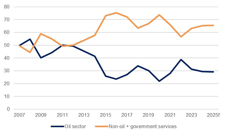 For the non-oil sector meanwhile, we maintain our projection of 4.0% growth, which would represent a moderate slowdown on last year but still denote a strong performance given slower global growth and an ongoing high interest rate environment. The PMI surveys for the first two months of the year have been somewhat mixed, with a decline in January followed by a marked recovery in February, but both readings were well above the neutral 50.0 level and continue to indicate a robust expansion in the non-oil private sector.