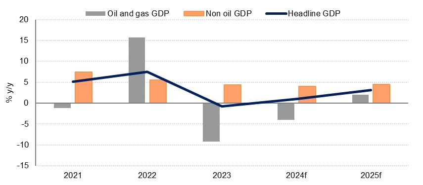 The methodology revision has led to our headline real GDP growth forecast for 2024 rising from 0.7% previously to 1.0%, even as our underlying sector growth projections remain unchanged. On March 3, Saudi Arabia confirmed what we had expected would happen, as it extended its 1mn b/d of production cuts until the end of Q2. In light of this we still expect Saudi Arabia’s oil production to fall to an average 9.2mn b/d in 2024, down from 9.6mn b/d in 2023, and so we forecast a contraction of 4.0% in oil & gas GDP this year. Some support could still come from the investment side even as ARAMCO has in January abandoned its plan to expand oil production capacity to 13mn b/d (from 12mn presently). In announcing its 2023 results, the company stated that capital investments this year would be ‘approximately USD 48 to USD 58bn’, compared with USD 49.7bn in 2023 (itself up 28%).