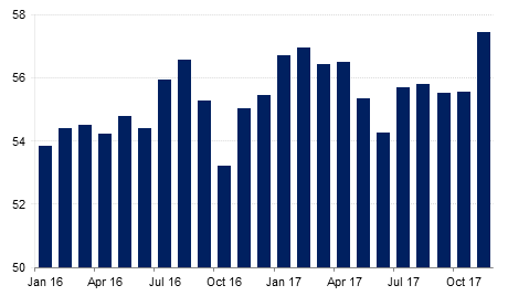 Output and new orders rose at the fastest rate in 2017 last month, with firmer export demand contributing to overall new orders growth. However, employment growth was modest, with the employment index easing to 50.7 in November, only slightly above the neutral 50-level.