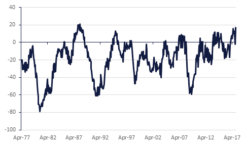 The UK’s CBI manufacturing survey was released yesterday, with orders remaining at the highest levels seen since 1988. The factory index stood at 17 for the second month running, exceeding analyst expectations of 15. The UK manufacturing industry has been benefitting from the positive effect on exports of a weaker pound since the Brexit vote, coupled with a more general resurgence in global trade. Export orders fell from 20 in November to 16 this month, but remain significantly higher than seen long-term averages. Motor vehicles and transport equipment have seen particularly strong demand.