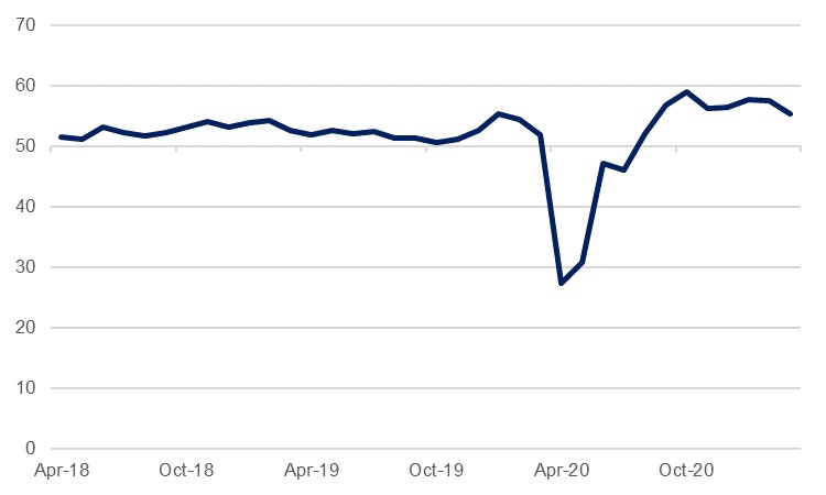 Our more bearish growth outlook is not to discount what we still believe will be a fairly robust turnaround in India this year, following a contraction of -7.5% in 2020/21. India’s manufacturing PMI survey has been consistently positive (above 50.0) since August last year, and averaged 56.9 over January to March, levels not seen since 2011. While the nature of the pandemic crisis meant that services were slower to recover from the April 2020 slump – when they hit just 5.4 – they have been positive since October, and averaged 54.2 over the past three months, and we do not expect that this positive momentum will be immediately derailed given the high level of fiscal and monetary support.