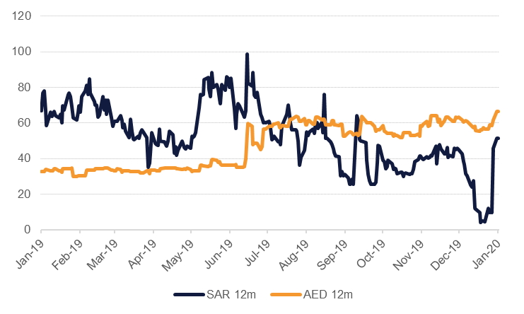 Markets are still on edge in response to the escalation in tensions between the US and Iran but have begun to look outside the region for more direction. Regional assets remain in focus but across the Middle East and North Africa, domestic equity indices showed a mixed performance while UAE bond spreads over benchmarks widened. Forward points for GCC currencies have spiked in response to the escalation in geopolitics but remain well below highs seen in the last five years: in Saudi Arabia’s case, 1-year SAR forwards are still lower than they were when Aramco infrastructure was attacked in September 2019.
