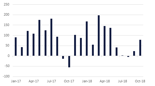 The latest tourism data for Dubai show total visitor numbers unchanged in the year to September compared with the same period in 2017, at 11.6mn people. Visitor numbers from the top 3 source markets (India, Saudi Arabia and the UK) were down y/y as were visitors from Oman, Kuwait and Pakistan. However, this was offset by a 60% rise in the number of tourists from Russia as well as more visitors from Germany (15% y/y), China (12% y/y) and the US (4% y/y). The latest Dubai Economy Tracker survey highlights the margin pressures for firms in the travel & tourism sector, as increased supply coupled with a lack of growth in demand this year have weighed on pricing in the sector. Supply in the hotel sector is expected to continue rising in 2019, as new capacity comes online ahead of Expo 2020.