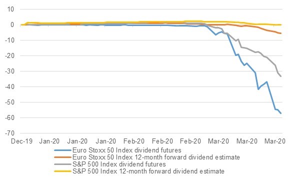 The dividend yield premium is often cited as a valuation tool. However, in light of a near-halt in economic activity owing to the viral outbreak, we are seeing more corporates announce cancellation or suspension of dividend payments. While analysts are yet to factor that in their models, the dividend futures on the S&P 500 index and the Euro Stoxx 50 index have already slumped 31% and 55% respectively in Q1 2020.
