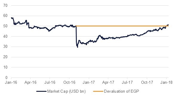 The EGX 30 index closed above the 15,000 level as it continued to build onto the gains of 2017. Interestingly, the market capitalization of the EGX 30 index has now crossed USD 50bn, the level at which it was before the country decided to devalue the EGP in late 2016. Following the devaluation, the market capitalization had fallen to below USD 30bn.