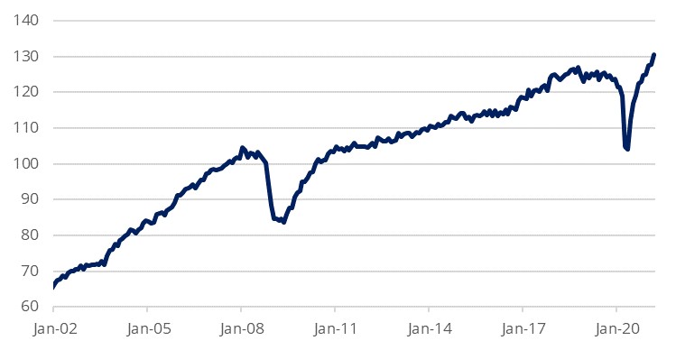 The recent spike in inflation across developed markets – see Central bankers push back against reflation narrative – has been caused in part by rising shipping costs, in turn driven by a remarkable recovery in global trade in recent months. Following the GFC, it took three years – until January 2011 – for the World Trade Volume Index to return to the pre-recession peak hit in January 2008. By contrast, last year the index had recovered to January 2020 levels by September. Not only that, but it has continued to climb rapidly in the intervening months, in contrast to the pre-pandemic period when volumes had been at best flatlining since the onset of the US-China trade wars in 2018. The world trade index has now surpassed the previous index high, hit in October 2018, and as of March its trajectory was resolutely upwards. Again, this is in contrast to the post-GFC recovery, which saw a much slower expansion in world trade as compared to prior to the crisis, and much ensuing commentary regarding the end of globalisation.