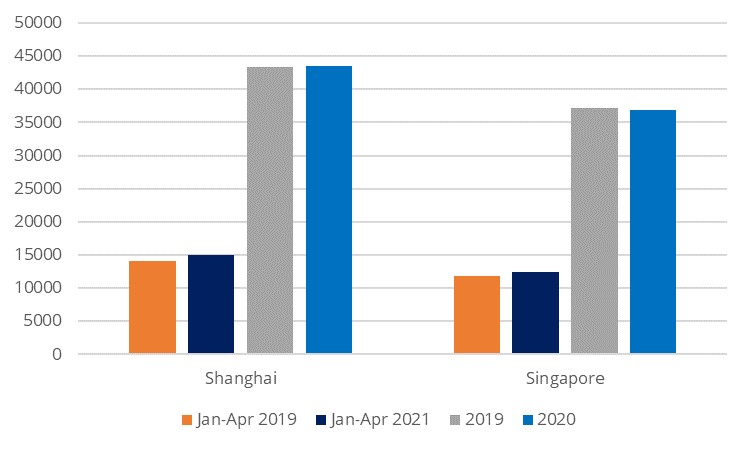 As a tangible indicator of this rebound in trade, the world’s two largest container shipping ports by TEU throughput – Shanghai and Singapore – have seen their January-April 2021 throughput volumes comfortably surpass 2019 levels, with even full-year 2020 having ultimately seen volumes flat on the previous year.