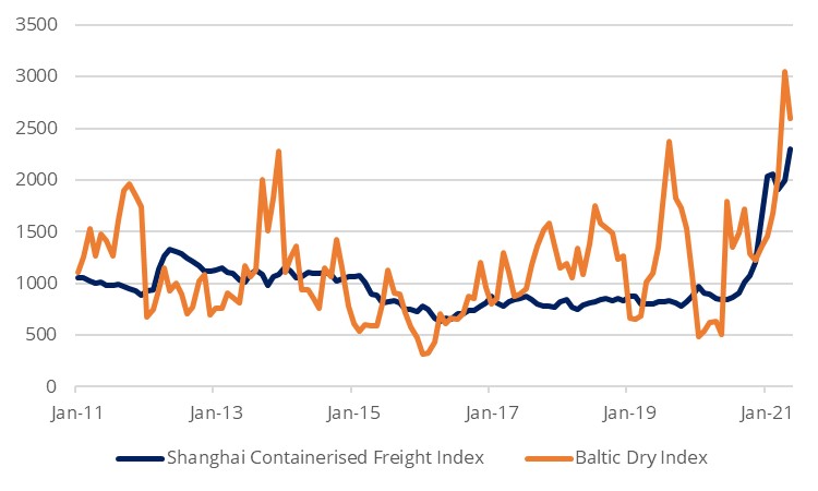 This rapid recovery has caught the shipping sector out. Long-term overcapacity issues and depressed returns in the wake of the GFC were gradually being ironed out by a period of scrapping and company consolidation. This left the fleet insufficient to cope with the present circumstances of elevated demand, and this has driven up prices. The Shanghai Containerised Freight Index has hit a series high of 2,296 in May, more than double the series average. There has been a similar story in dry bulk shipping as the Baltic Dry Index, despite having fallen from the recent peak earlier this month, is still at levels last seen in 2013.