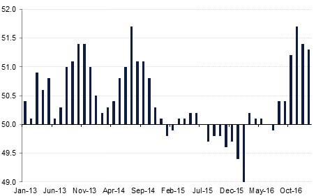 China’s official PMI figures for January were released earlier this morning, providing some reassurance that growth has stabilized at the start of 2017.The non-manufacturing PMI came in at 54.6, while the manufacturing PMI held steady at 51.3.