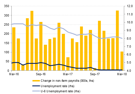 Federal Reserve chair Jerome Powell gave his first speech on the outlook for the US economy on Friday, reiterating that the risks were ‘evenly balanced’ and that ‘further gradual rate increases’ would best promote the Fed’s goals of economic expansion, 2% inflation and a strong labour market. He made no mention of the risk of a trade war in the speech, although he has said separately that it is too soon to know if it will make any impact on the economy. Despite Powell’s positive talk on the labour market, non-farm payroll numbers in the US disappointed to the downside last week, coming in at 103,000 in March, compared to consensus expectations of 193,000 and 326,000 in February. This marked the lowest level in six months, with bad weather being cited as a likely cause – the construction sector was one of the worst-performing. Wages rose 2.7% y/y, while unemployment was 4.1%, just missing expectations of 4.0%.