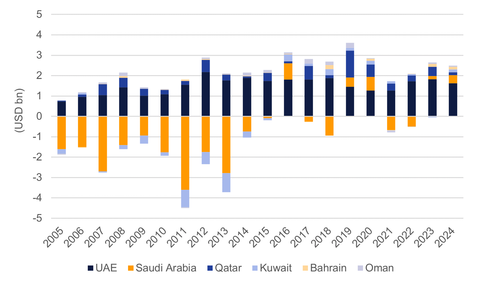 As far as exposure to direct tariffs, the GCC economies do not appear as priority targets for the new US administration. For both 2023 and 2024 all of the GCC economies ran trade deficits with the US (importing more from the US than they exported) as hydrocarbon exports from the region have dropped substantially. In October 2024, the US imported just 221k b/d of oil and products from Saudi Arabia, down from around 1m b/d a decade earlier.