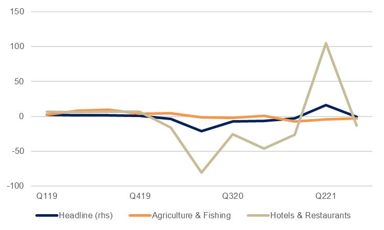 Tunisia’s recovery from the pandemic crisis and the -9.7% contraction seen in 2020 looks set to be a drawn-out affair, not least as the country continues to grapple with new outbreaks of the virus. Last year we estimate that real GDP growth in Tunisia was a lacklustre 3.0% as the country was hit by a severe wave of coronavirus in the summer months which impeded the recovery seen elsewhere in the world. Indeed, growth in both Q1 and Q3 last year was negative, offset by a double-digit expansion in the second quarter. The impact of this renewed spread of the virus was especially apparent in the hotels and restaurants component of GDP which contracted by -13.1% y/y in Q3, following a 104.7% expansion the previous quarter.