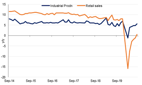 China’s industrial production rose by a bigger than expected 5.6% y/y in August, faster than the 4.8% growth seen in July. Retail sales increased 0.5% y/y, the first increase this year, suggesting that consumer demand is starting to recover. Unemployment also edged lower to 5.6% from 5.7% previously. Eurozone industrial production rose 4.1% m/m in July, slower than the 9.5% rise in June and fractionally lower than the market had expected. Output remains below pre-coronavirus levels however.