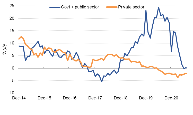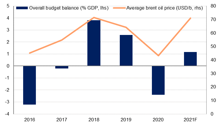 Oil revenue is set to rise by 30% on the back of both increased production since August and higher oil prices – we estimate the average Brent price this year will be 64% higher than in 2020. Non-oil revenues will also recover as the economy returns to growth after last year’s Covid-induced recession. On the expenditure front, we now expect only a modest increase in expenditure this year, as last year’s actual spending was higher than initially estimated.