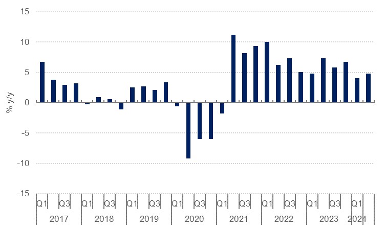 Other sectors related to tourism also performed well, with accommodation & food services seeing Q2 growth of 5.8%, up from 4.6% in Q1. Visitor numbers to the UAE have continued to increase even as post-pandemic reopening gains are all long won, with Dubai seeing 15.0mn visitors over the January to October period, y/y growth of 7.6%. According to the Ministry of Economy statement, total visitor numbers to the UAE hit 15.3mn over the first half of the year, up 10.5% on the same period in 2023 (see Dubai: Tourism sector hits new record in H1 2024).