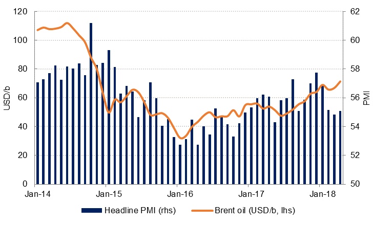 Businesses were more upbeat in April about future output, on average. More than half of the firms surveyed in April expected their output to be higher in twelve months’ time, compared with 28% in March and less than 15% in February. An expected economic upturn, new product launches and improved marketing strategies were all cited as factors behind the positive sentiment last month. We believe higher oil prices have also contributed to positive sentiment in the private sector.