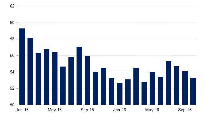 The October PMI reading suggests that growth momentum in the UAE’s non-oil private sector slowed at the start of Q4 following a relatively strong Q3. Year-to-date, the PMI averaged 53.8, well below the average of 56.0 in 2015. Consequently, we remain comfortable with our real GDP growth forecasts of 3.0% for the UAE this year, down from 3.8% in 2015.
