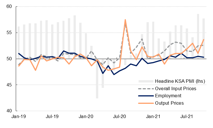 Purchasing activity picked up in October and input costs rose at a similar rate to September. Firms in Saudi Arabia have passed through their higher purchase costs to buyers however, with selling prices rising at the fastest rate since last summer (when VAT was increased). Businesses remain optimistic about their future output although the future output index slipped slightly in October to 58.1. Higher oil prices in recent months have likely underpinned positive sentiment in the private sector.