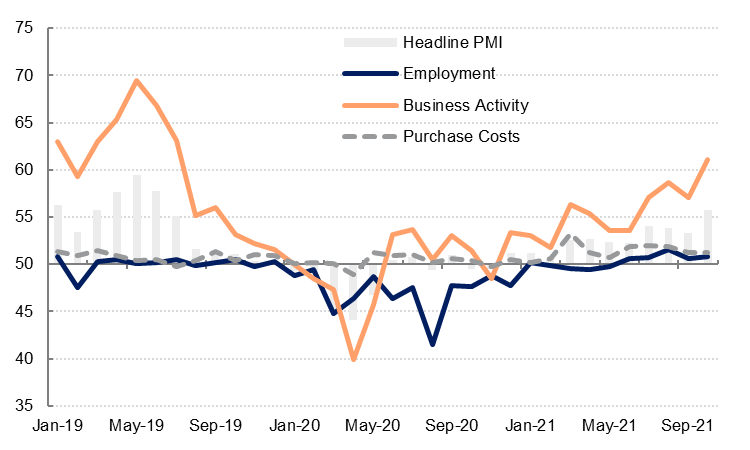 The UAE’s headline PMI rose to 55.7 in October from 53.3 in September, the highest reading since mid-2019. The main driver of the improvement was a sharp acceleration in business activity and new work, which were attributed to the start of Expo 2020. Export demand remained relatively soft last month. The increase in domestic demand in October led to only a slight increase in private sector employment however, and staff costs declined fractionally for the first time since January. Backlogs of work at private sector firms increased for the fourth month in a row.