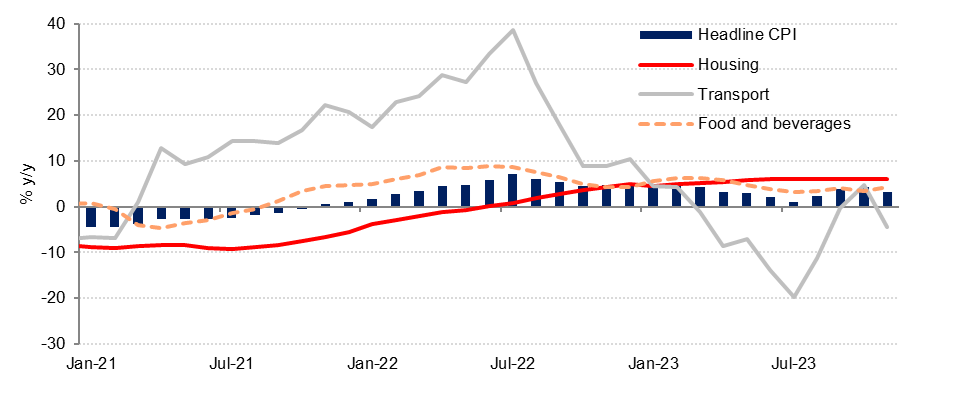 We expect housing costs to remain the key driver of inflation in 2024, as the lagged impact of last year’s increase in rents continues to feed through to the official CPI. However, we expect all other components of the CPI to see slower price growth in 2024 compared with 2023, helping to keep overall inflation contained to an average of 3.0%.