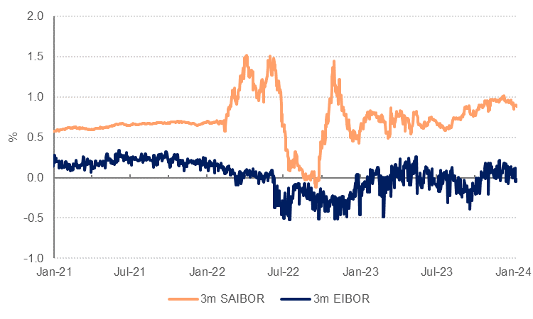 Excess liquidity in the UAE banking system helped to keep 3m AED interbank rates in line with the underlying 3m USD rate, with zero spread on average over the year. To the extent that lower borrowing costs in 2H 2024 spur demand for credit, and deposit growth slows, we could see some modest widening in AED 3m rates over the underlying SOFR rate over the course of 2024.