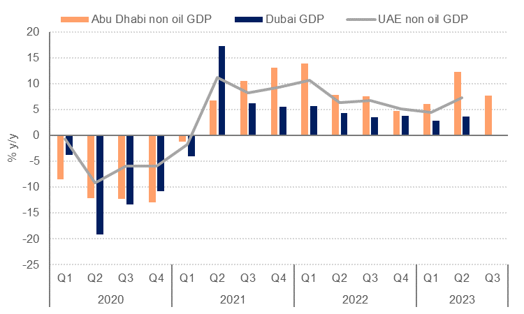 The UAE economy proved remarkably resilient to weaker global growth and higher interest rates in 2023. While GDP growth did slow from the 7.9% recorded in 2022, both oil and non-oil GDP likely came in ahead of our forecasts. We had pencilled in a -2% contraction in oil and gas GDP in 2023, but Bloomberg oil production data shows the UAE produced 3.15mn b/d on average last year, almost unchanged from 2022, so we have revised our estimate for oil and gas GDP growth up to zero in 2023.