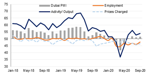 The Dubai PMI rose to 51.5 in September from 50.9 in August, as output and new work increased at the fastest rate so far this year. Panellists noted increased client demand although this was likely due in part to further discounts on selling prices. Employment at private sector firms declined for the seventh month in a row in September, although at the slowest rate since February, as firms sought to reduce costs. The survey data suggests that Dubai’s economy returned to modest growth in the third quarter, after contracting in H1 2020.
