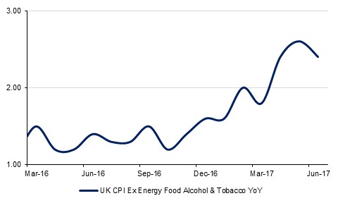 UK inflation rate slipped to 2.6% in June, weaker than expectations of 2.9%. This is the first drop that has been registered since October last year. Core inflation -- which excludes volatile food and energy prices -- slipped to 2.4% from 2.6% in May. Food prices fell 0.2% on the month. The pound’s 12% decline since the Brexit vote has been the main contributor to UK inflation in the last one year. There are signs that pressure is now easing: import prices for factories slipped 0.2% on the month and the annual rate of gains slowed to 10% from 12%. Given GBP’s recent strength, it is not surprising to see some reduction in inflation which in turn should reduce the pressure on BoE for any rate hike. Even if inflation does recover, the decision to hike rates will still hinge on the growth outlook which is being hampered by political uncertainty.